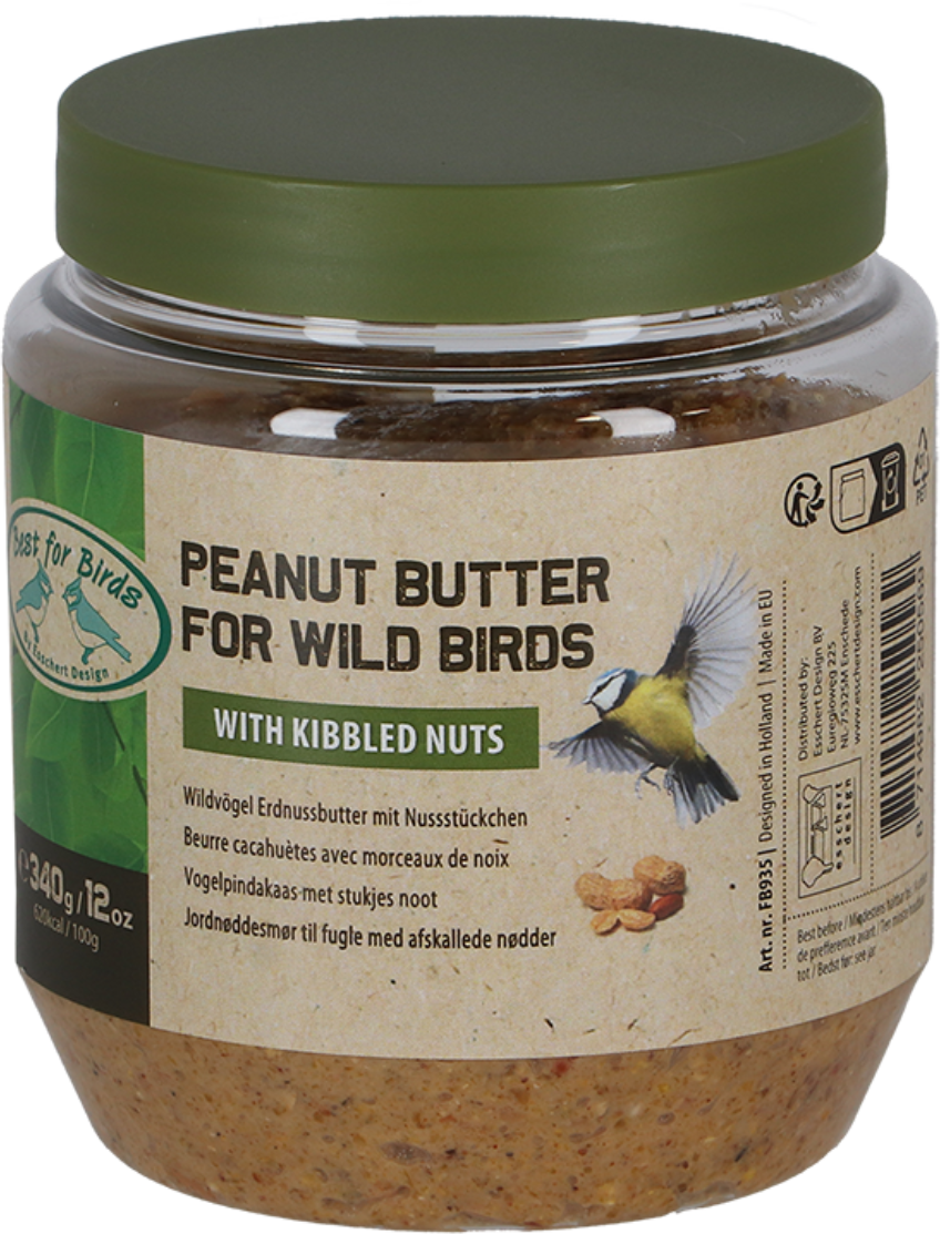This peanut butter contains crunchy kibbled nuts and is a great source of valuable fat for birds. It is suitable for year-round feeding and is a nutritious food source for many species of wild birds in the garden.