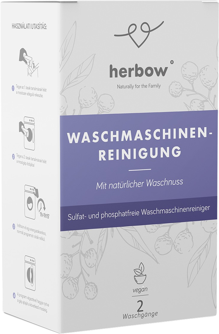 The herbow washing machine cleaner effectively removes limescale deposits and detergent residues. A single application cleans the machine and protects the heating element. The natural cleaner is free from chlorine, phosphates and sulphates. Perfect for a clean and disinfected washing machine.