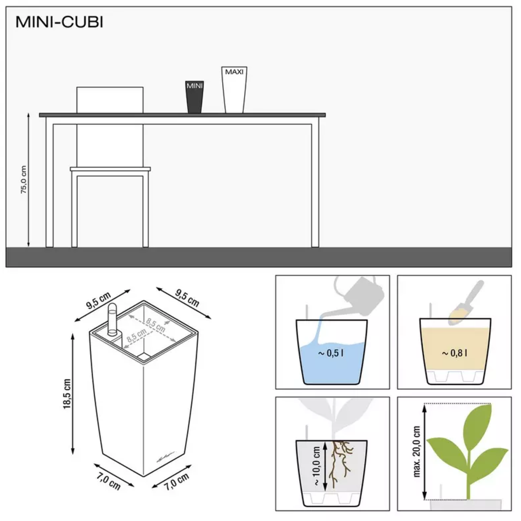 The MINI-CUBI combines elegant design with practical handling and high-quality workmanship. With its slim, modern format, it adds a stylish accent to any living space. Thanks to the integrated water reservoir, plants remain optimally supplied with water, even if you have less time to tend to them. The different colour options make it a versatile decorative element - perfect for a harmonious, modern look in your home.