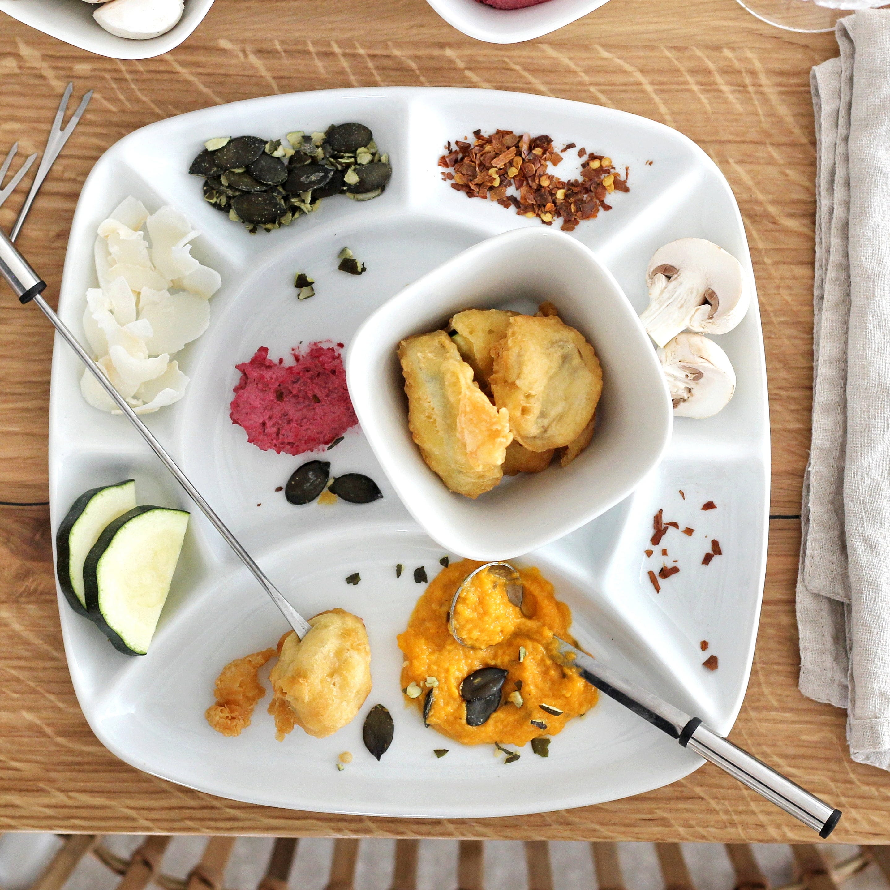 The high edges ensure that sauces do not run into each other and everything remains appetising. Whether for a cosy fondue evening, as a versatile serving platter for snacks, or for arranging finger food at your next party – this easy-care set is absolutely suitable for everyday use and can be effortlessly cleaned in the dishwasher after use!