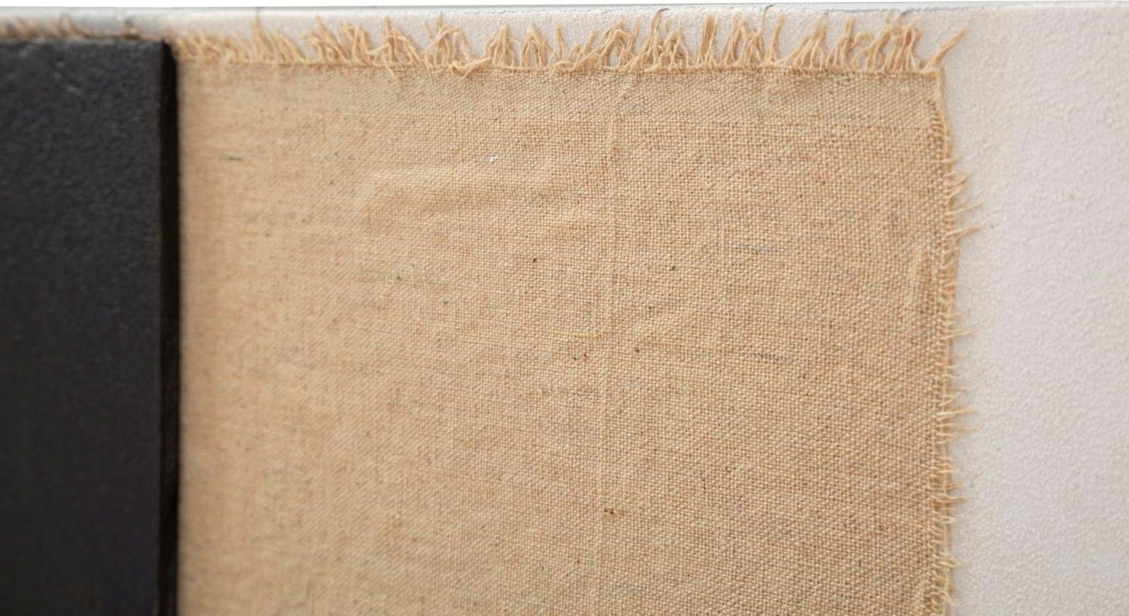 The artwork combines large-scale, black geometry with warm beige tones on a light canvas. A special visual and tactile highlight is the relief-like applications that run in precise arcs, as well as the deliberately frayed edges of the fabric elements. Stretched on a sturdy wooden frame, this wall art offers a unique blend of architectural rigour and natural texture.