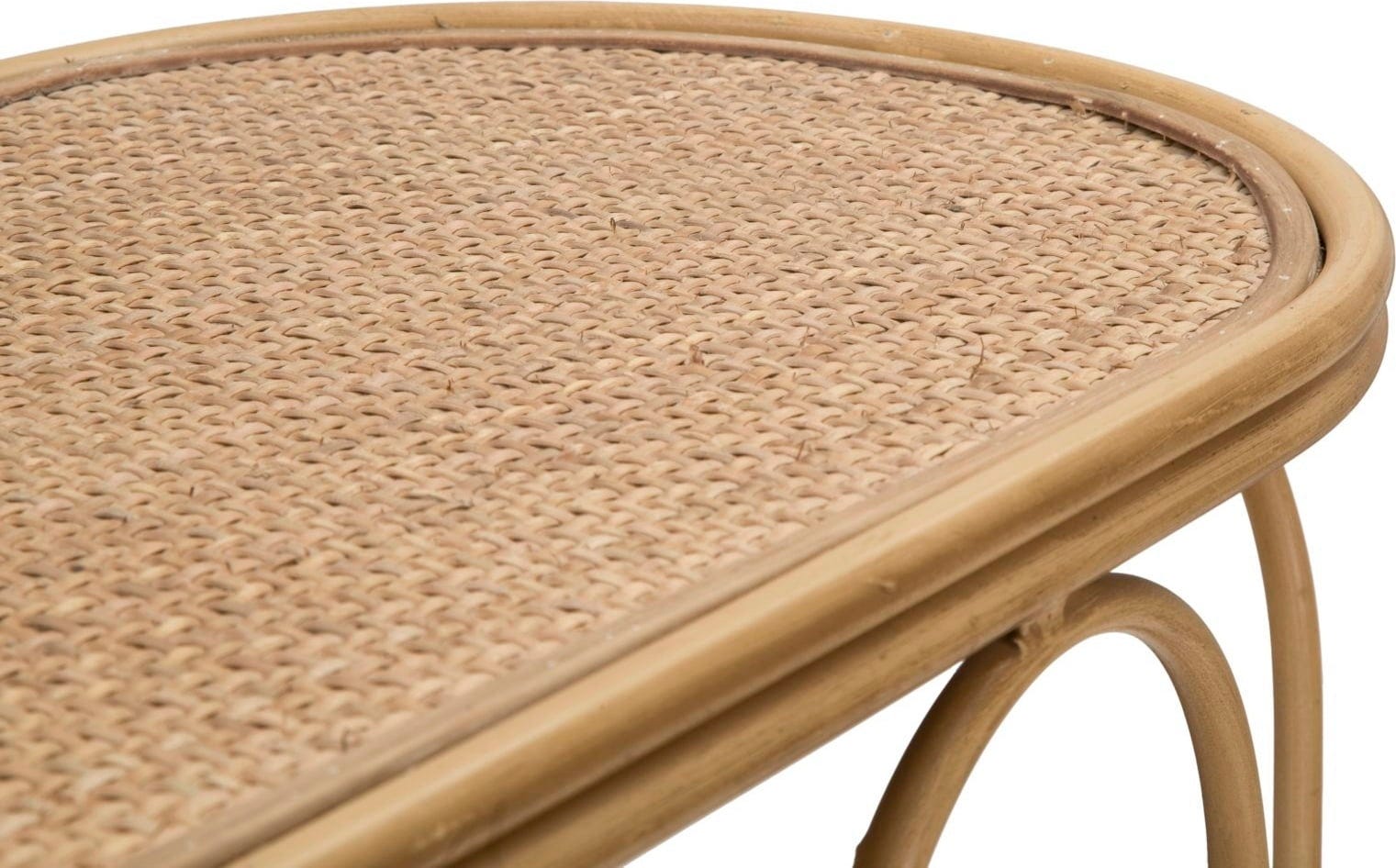 Give your entrance area or living room a warm and inviting atmosphere with this elegant console table. The design is inspired by natural materials and impresses with its soft, curved lines and rounded sides. The high frame is made of metal and skilfully imitates the look of bamboo canes. The oval storage surface is covered with a fine rattan weave.
