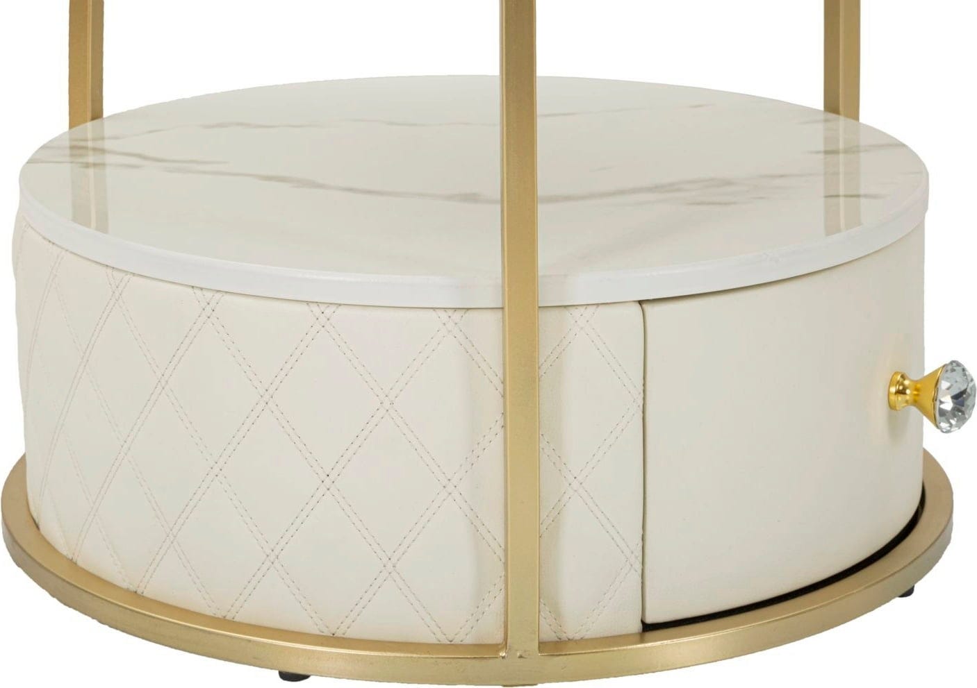 Add a luxurious and elegant accent to your bedroom with this round bedside table. It impresses with the combination of a gold-coloured metal frame and a top panel, as well as a shelf in a sophisticated marble look. The lower drawer unit offers discreet storage space and is covered on the sides with luxurious, quilted faux leather, giving the table a noticeable, sophisticated texture.