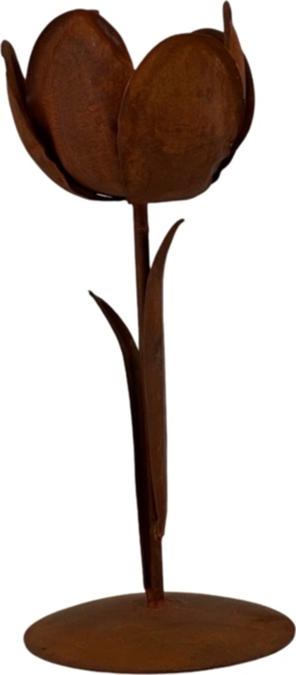 The “Tulip” candle holder adds a touch of romantic charm to any table. Designed in the shape of a delicate flower, it provides a decorative setting for taper candles. Made from sturdy iron with a rustic antique finish, it combines floral elegance with rustic charm.