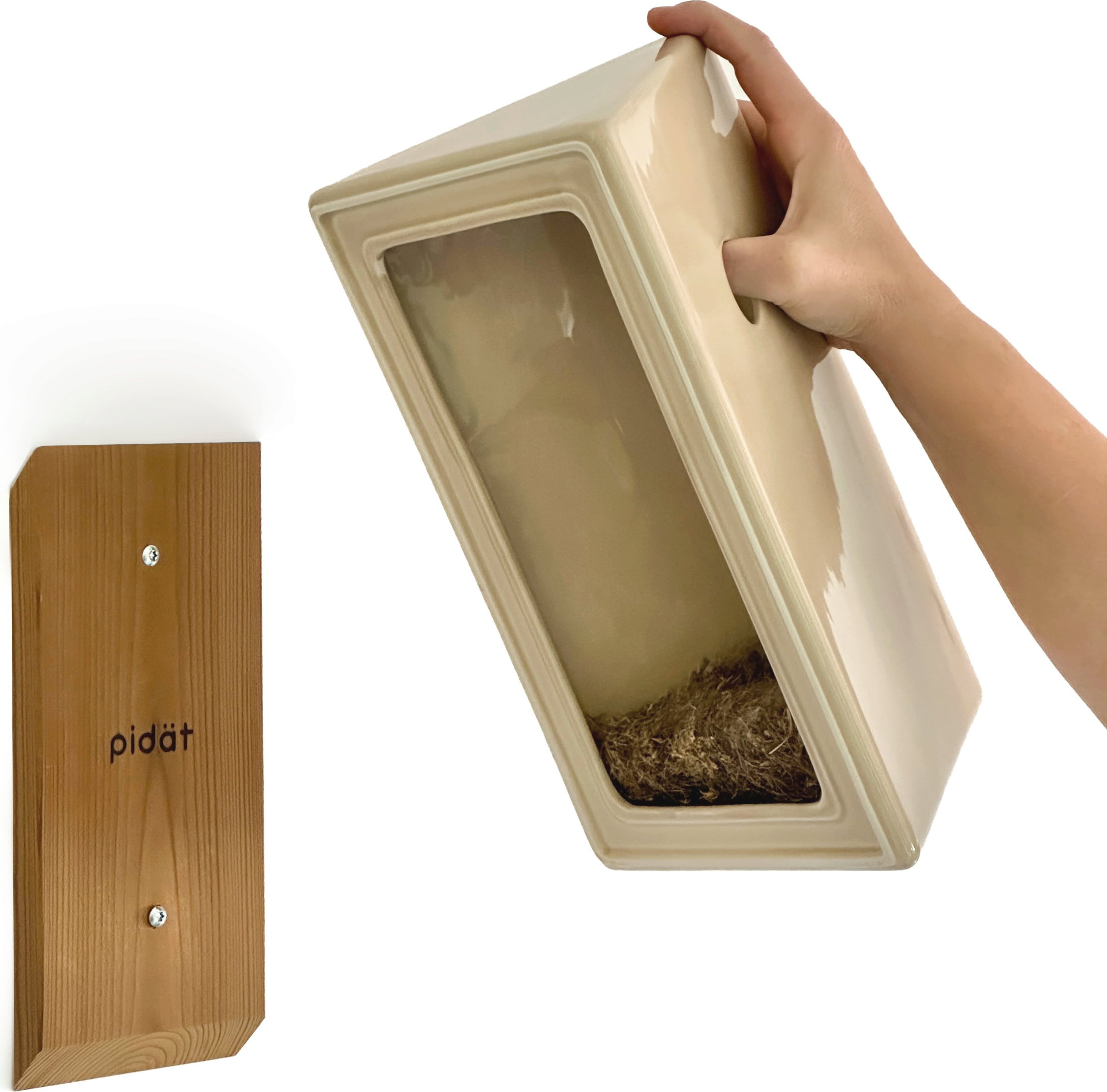 Handcrafted in Portugal from non-toxic, heat-treated pine wood and glazed ceramic, the bird house features a roughened texture on the inside below the opening to help birds climb out more easily.