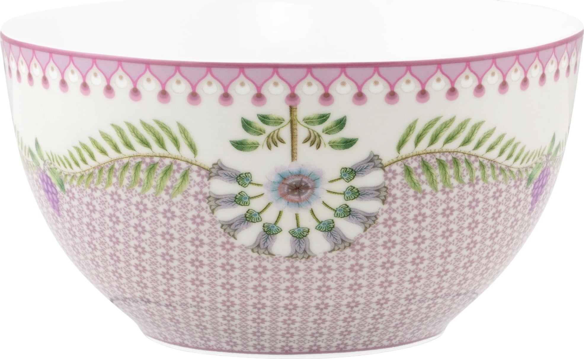 Serve your favourite dishes or snacks in this beautiful bowl from the Lily & Lotus collection by Pip Studio. The bowl is decorated with small flowers, grapes and graceful shapes arranged symmetrically, giving it a modern yet timeless touch. The chic colour combinations with subtle patterns and golden accents on the upper rim create a harmonious atmosphere.