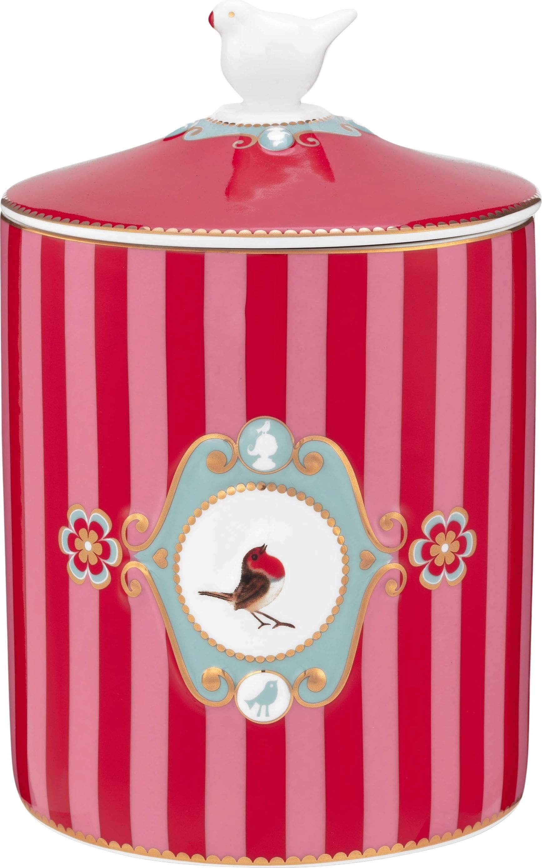 Made from the finest porcelain, it boasts an eye-catching design: stripes in 2 shades of colour wrap around the jar, while a charming bird sits on the side and on the lid. Luxurious gold details add shiny accents and give this piece a particularly elegant touch. It serves as a practical helper and a decorative piece, enhancing your kitchen and making it an eye-catcher.