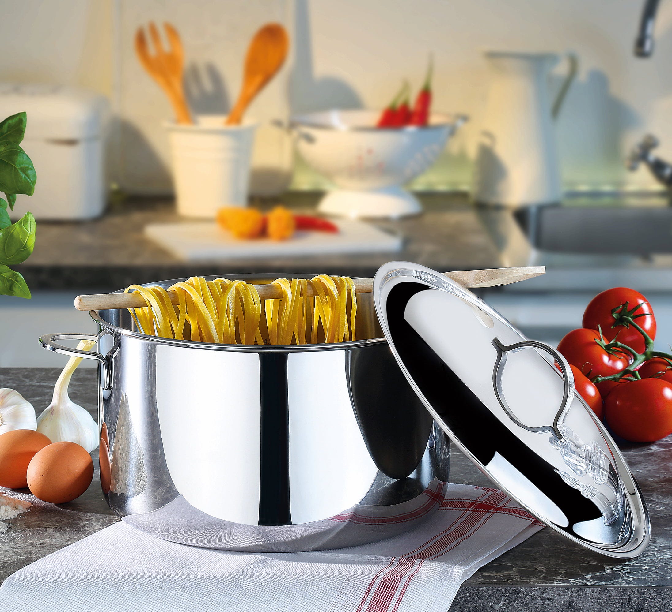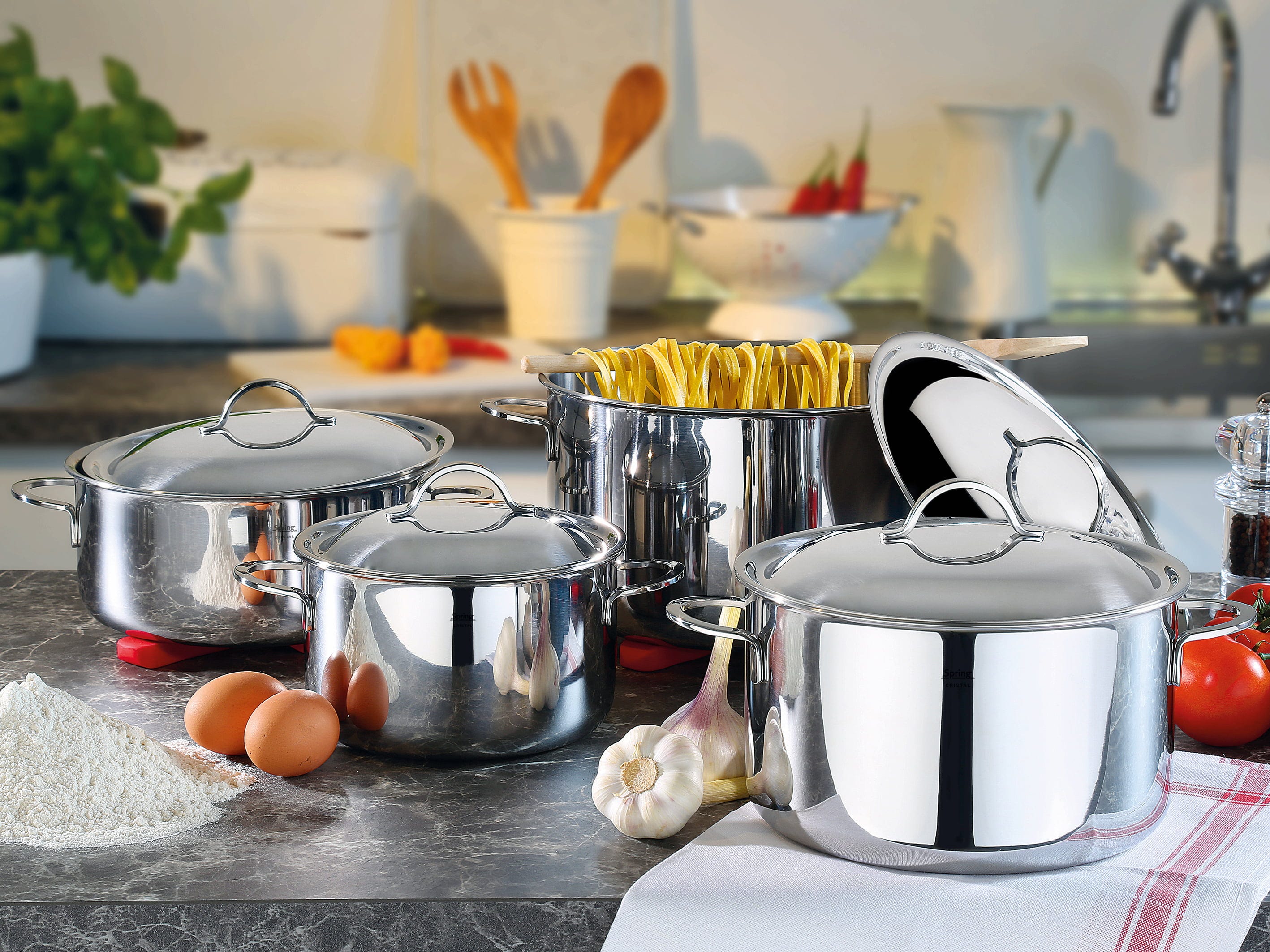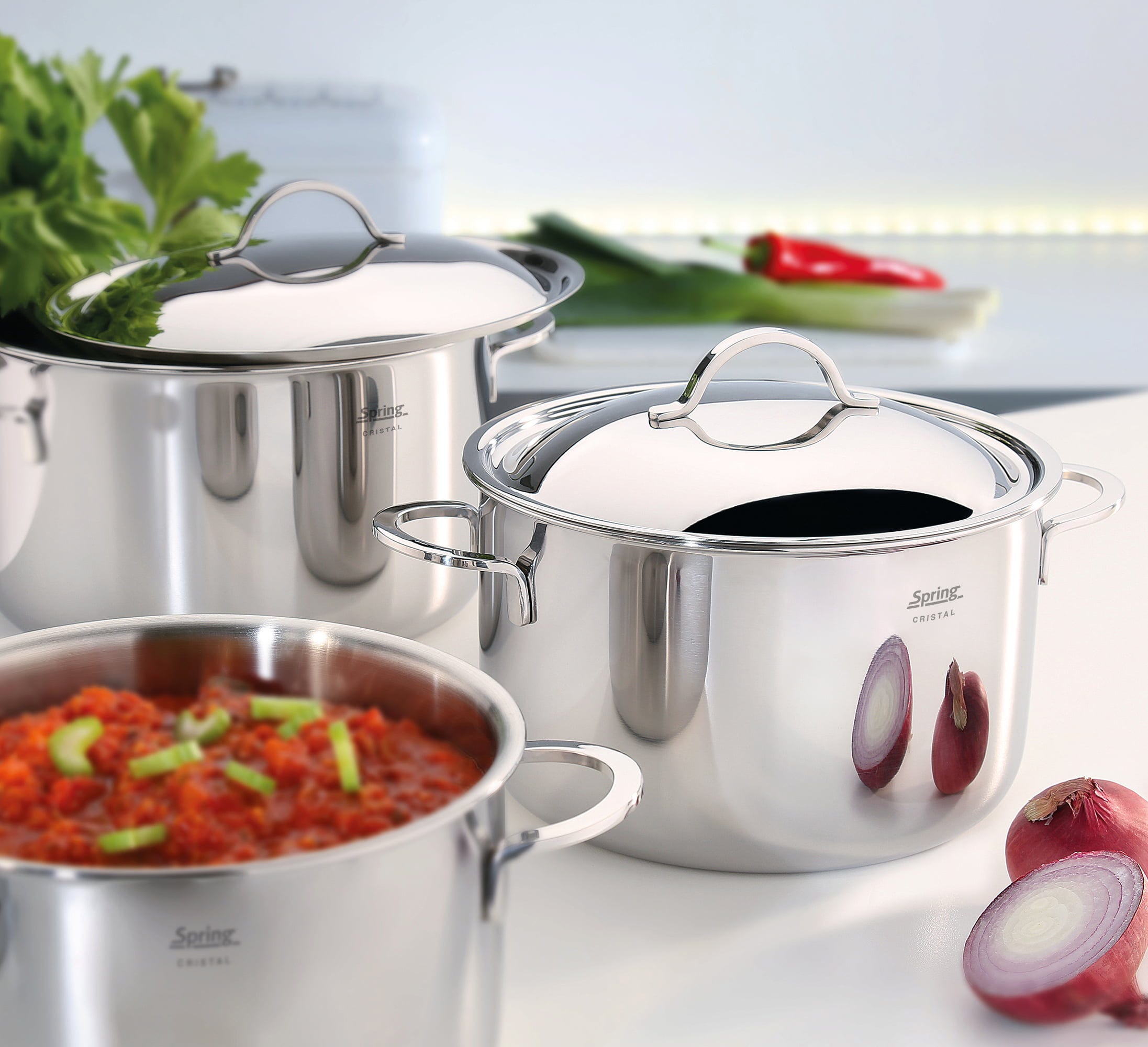For over 25 years, the Cristal series by Spring has been part of the basic equipment of every sophisticated kitchen. The secret of this classic lies in the 5 multi-layer material, which not only keeps the heat on the base, but also conducts it directly into the walls of the pan. This means that the food is heated evenly from all sides, preserving vitamins and saving energy.