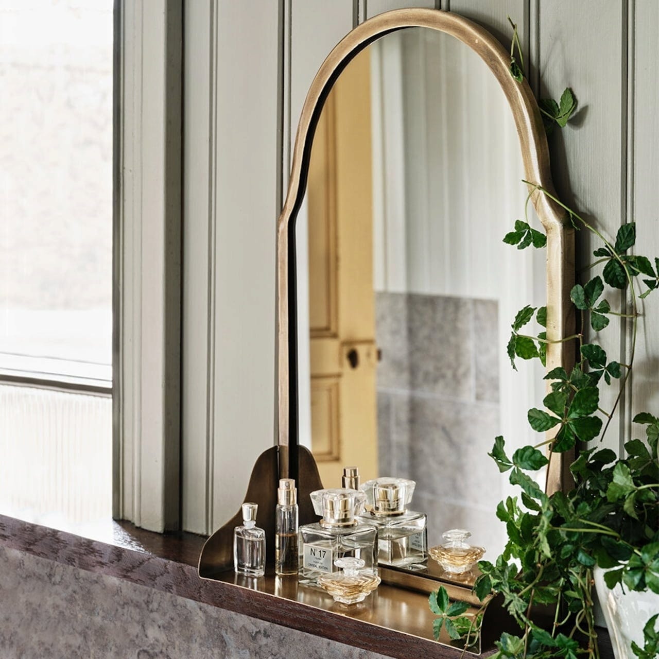 This beautifully shaped mirror in an antique vintage look makes a lovely addition to your bathroom, hallway or makeup table. The frame is made of metal and has an elegant brass finish. The shelf is ideal for storing cosmetics, perfume, plants or other small items.