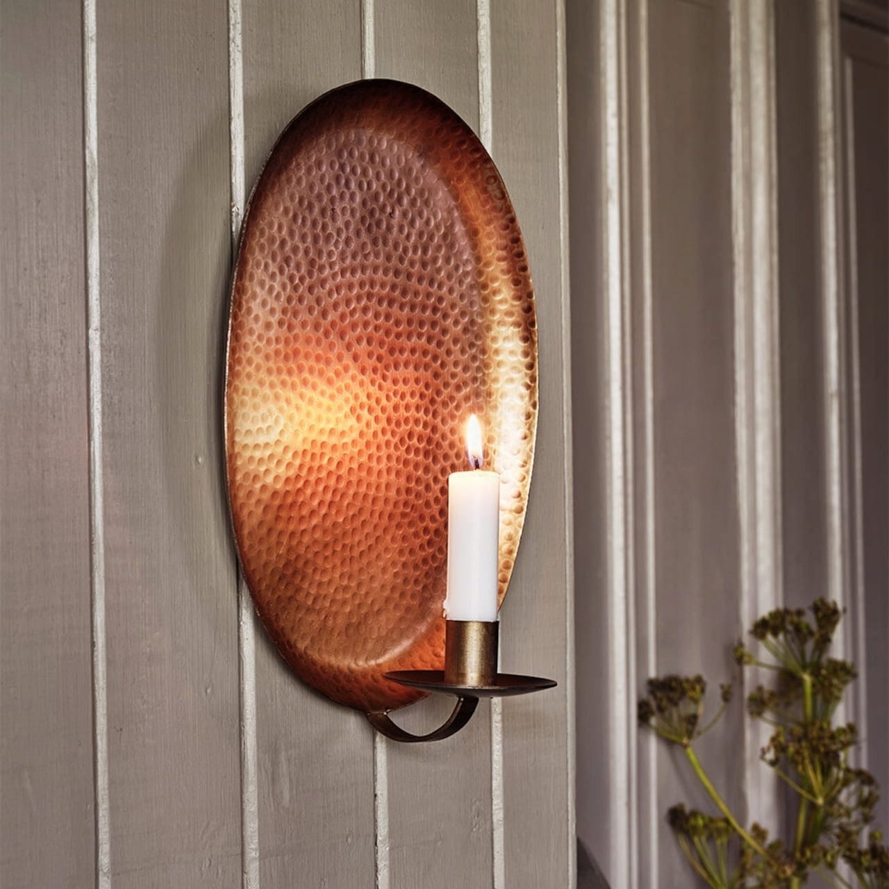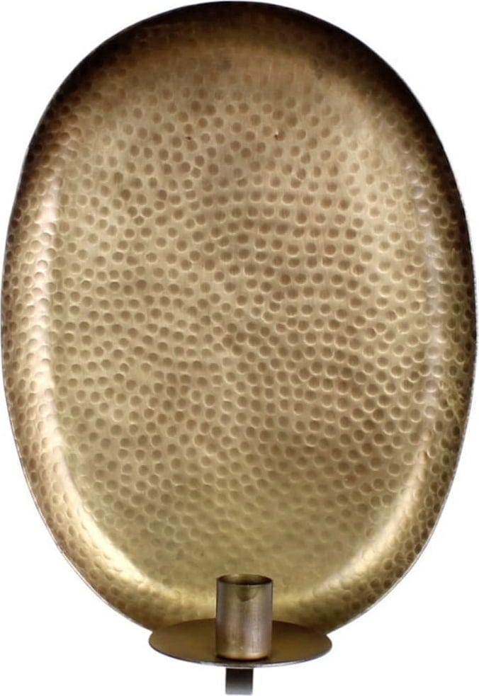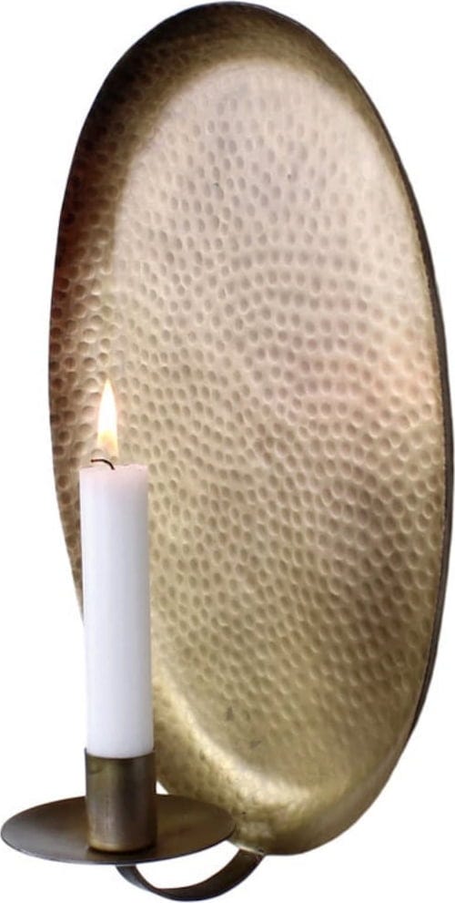 This beautiful candleholder can be mounted on the wall, saving space and offering a unique source of light. The back of the candleholder is made of hammered metal and reflects the glow of the candle, creating a lovely atmosphere. The antique brass surface is elegant without being intrusive.